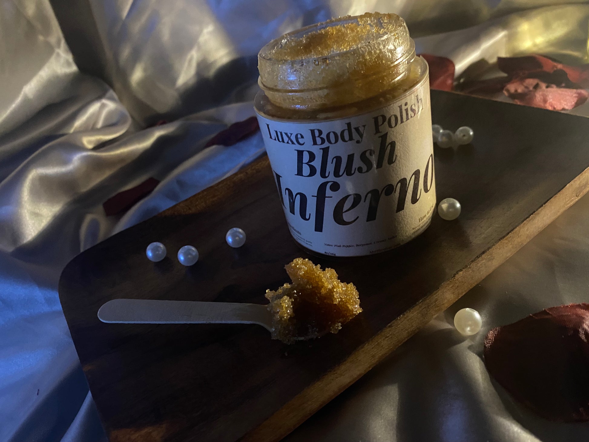 Blush Inferno is a warm, seductive sugar polish infused with rose, vanilla, tonka, and musk. It gently exfoliates while melting into your skin, leaving you soft, glowing, and kissed with a sweet, sultry scent.